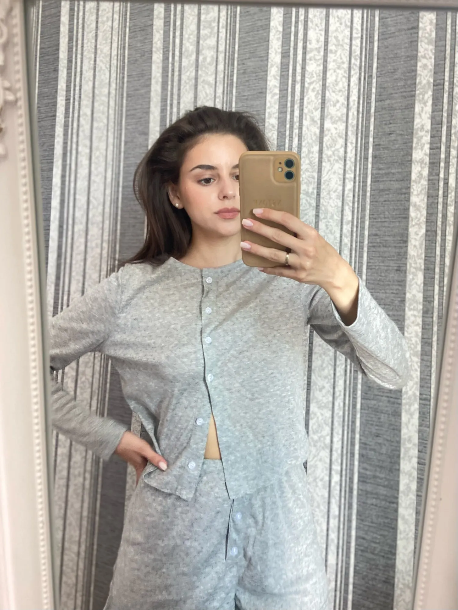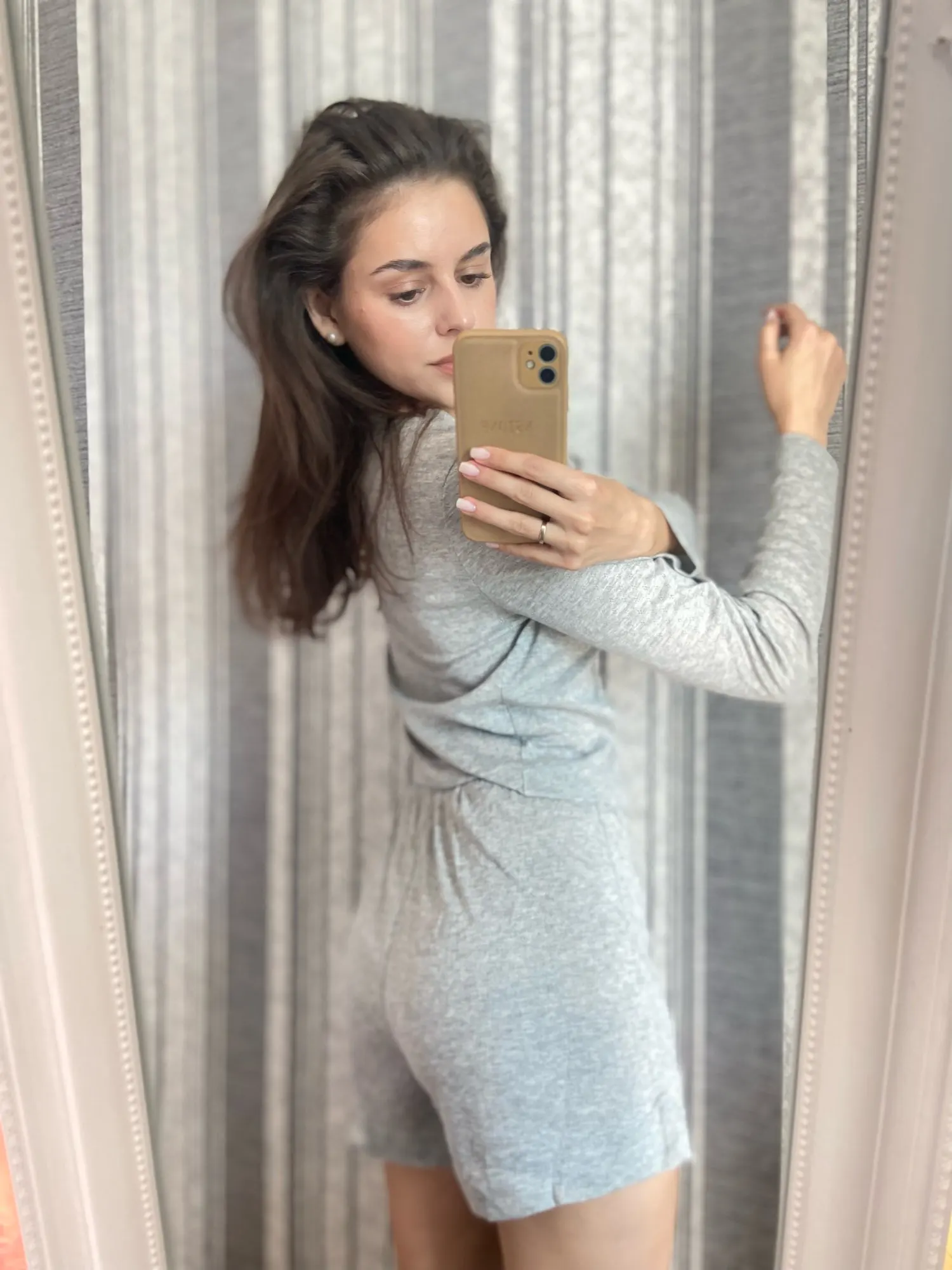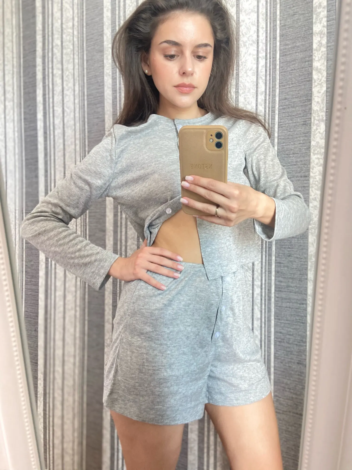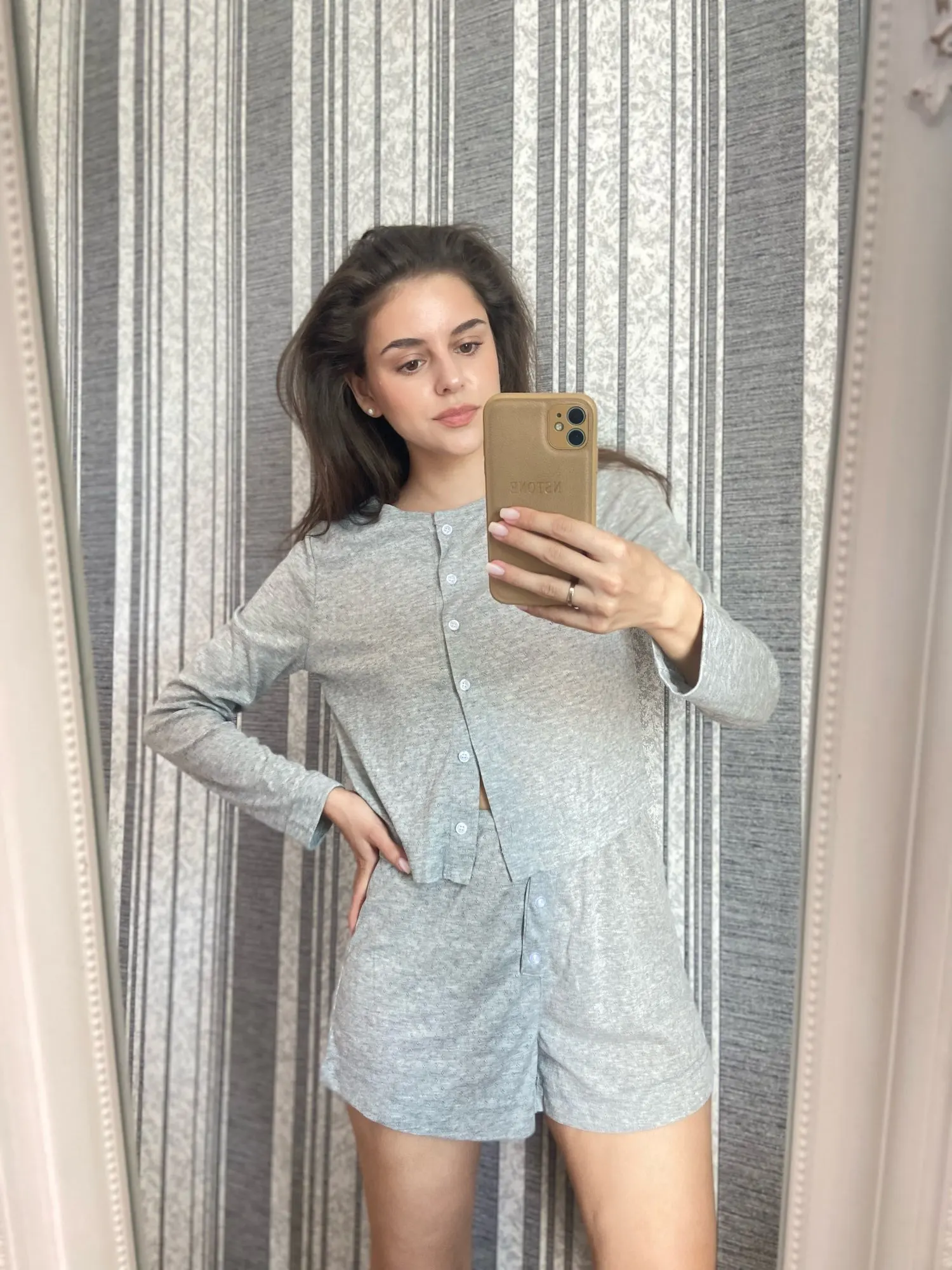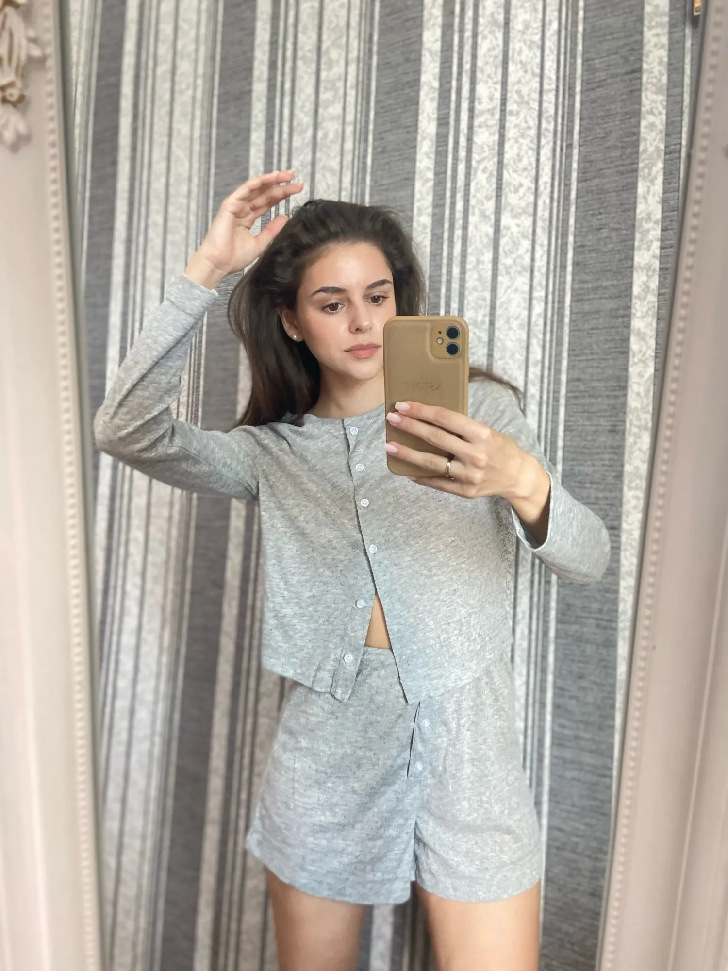 Great suit! I hesitated for a long time whether to order or not, but decided during the sale, and now it has become even cheaper. 🤪 For OG 94, OT 75, OB 106, size L fits well, not too tight, almost like in the model's photo. The length of sleeves and shorts is normal for a height of 175 cm. I was afraid that the shorts would be too small, but no, they are acceptable. I hope it won't shrink after washing. The fabric is VERY pleasant to touch. The color in person is very successful, a light gray pearl. You can confidently wear the blouse 'out and about', which is exactly what I'm going to do. If the seller had other colors, I would have ordered more. The quality of tailoring is also good.